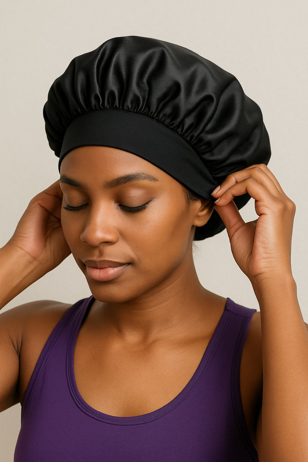 Our satin bonnet prevents friction while you sleep, locking in moisture and keeping your hair smooth, shiny, and manageable.
